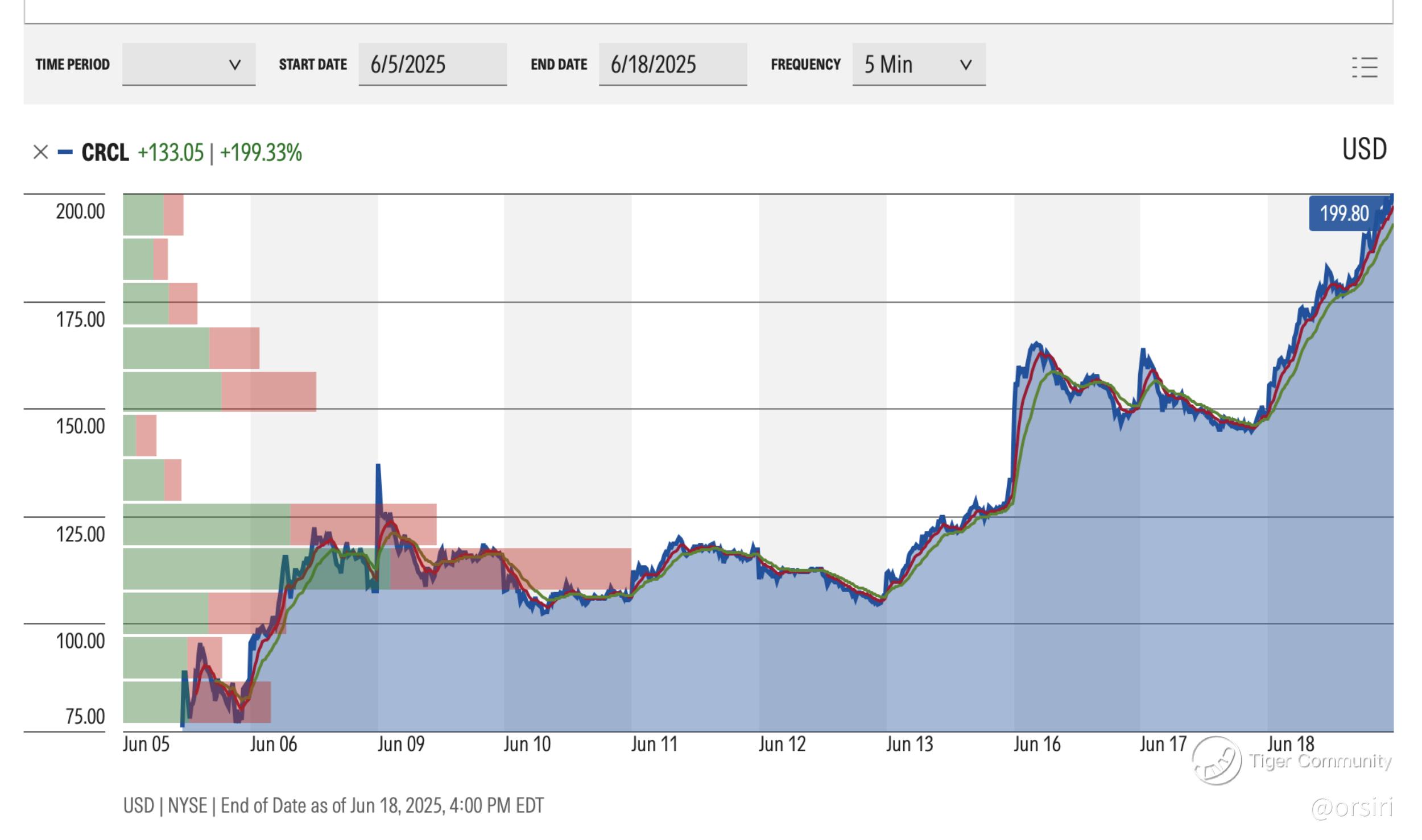 In fact, Circle beat the news to the punch. On 5 June, it debuted on the NYSE under the ticker $Circle Internet Corp.(CRCL)$, opening at $31 and soaring to an intraday high of $103.75. Now sporting a market cap of roughly $22 billion, the company’s timing was nothing short of—well—genius.
