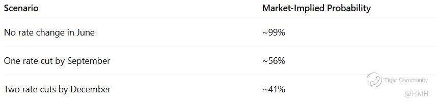 Ahead of the Fed meeting, markets widely anticipated no change in rates, and that expectation materialized. But forward-looking indicators now reflect a moderate probability of one or two cuts by the end of the year. Futures markets suggest investors are split: roughly a 56% chance of one cut by September and about a 41% chance of two cuts by December.