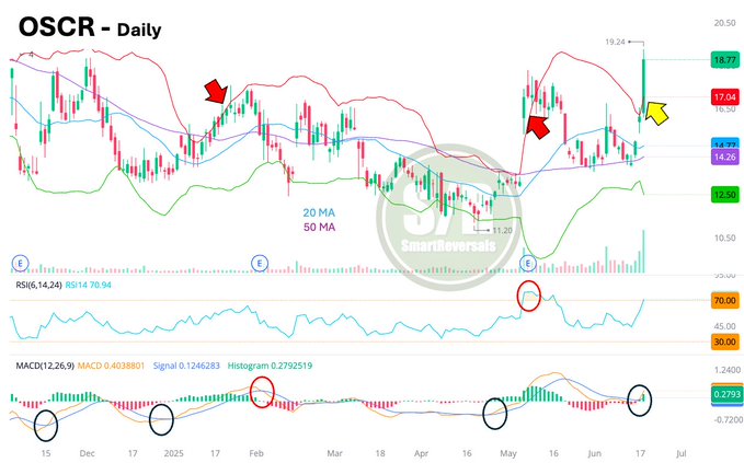 $Oscar Health, Inc.(OSCR)$ : The 50-day moving average (50DMA) provided a solid launchpad for the price, which has now broken out above the upper Bollinger Band. The current candle suggests a bullish continuation in the short term, a sentiment echoed by the MACD.