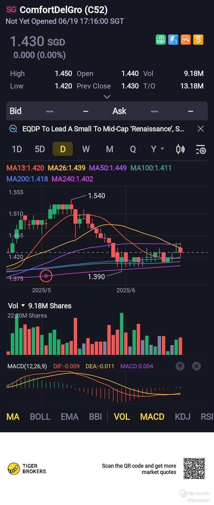 ComfortDelGro - good price is back. I am waiting to add some at 1.40 and below.At 1.41, yield is 5.5 percent which is very nice yield level for me!