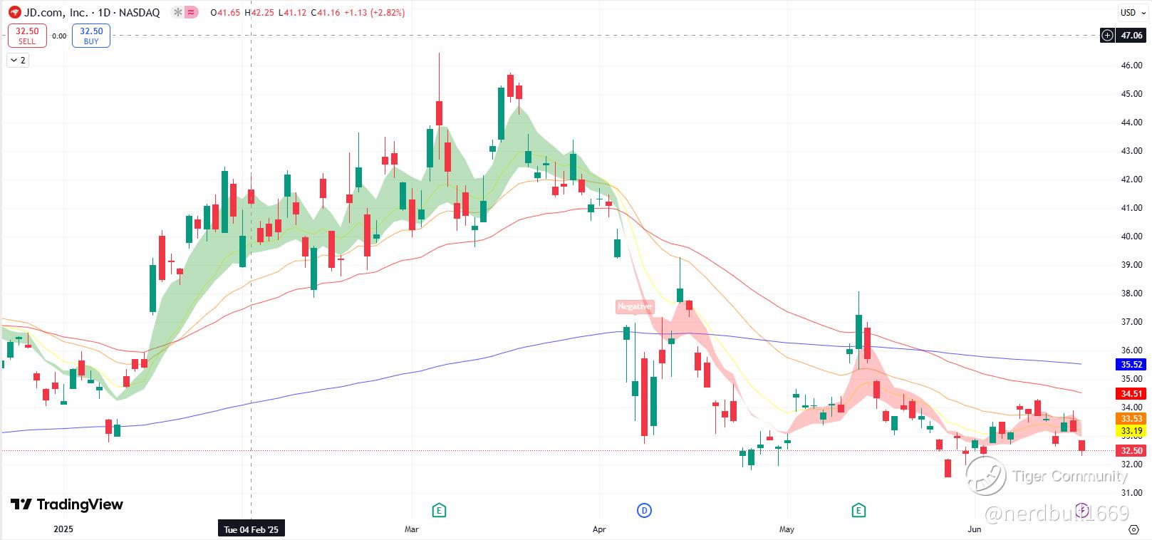 The weak momentum as seen from RSI have seen the bears in control since April, and this might continue as currently JD is trading below the 26-EMA, and with the sluggish consumer spending in China, we might see further decline in JD.com share price.