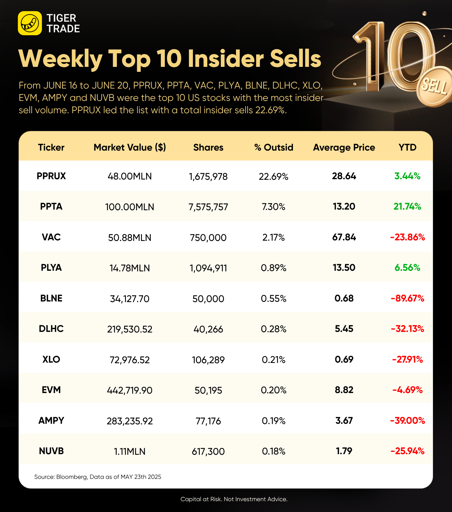 The following are the top 20 stocks with the highest insider Sells % relative to outstanding shares in the past week. Data source: Bloomberg, data cutoff date: June 23rd, 2025.