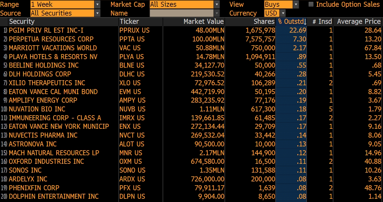Firstly, the top 10 insider stock sales, ranked by Insider Sell %, were $PGIM Private Real Estate Fund $Perpetua Resources Corp.(PPTA)$ $Marriott Vacations(VAC)$ $Playa Hotels & Resorts NV(PLYA)$ $Beeline Holdings(BLNE)$ $DLH Holdings Corp(DLHC)$ $XILIO THERAPEUTICS, INC.(XLO)$ $Eaton Vance California Municipal Bond Fund(EVM)$ $Amplify Energy Corp.(AMPY)$ $Nuvation Bio, Inc.(NUVB)$