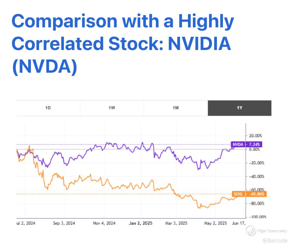 I also passed on the SOXL opportunity and that deserves its own breakdown. With around 25% exposure to $NVDA, SOXL closely tracks the NYSE Semiconductor Index. Since January 2023, $NVDA surged 875%, yet SOXL was down -50.63% YTD as of June 2025. That performance gap reflects the inherent volatility decay in 3× leveraged ETFs.