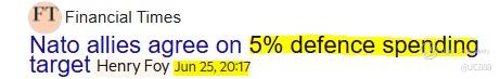 One reason why those expectations may rise is the “agreed” push from Trump for NATO allies to ramp up defense spending. (see below)