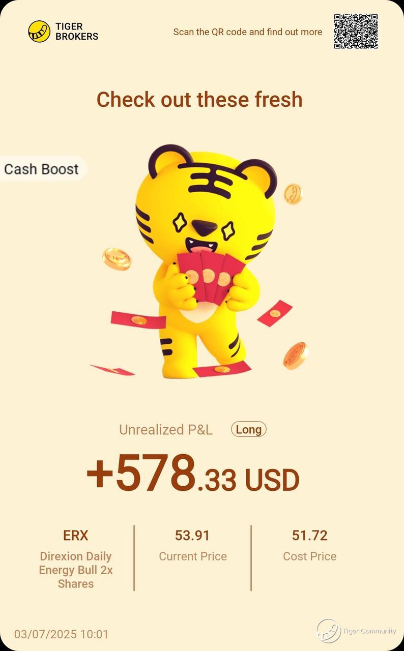 $Direxion Daily Energy Bull 2x Shares(ERX)$ gained $578 in a single day, boosted by a rebound in oil prices. Entered at $51.72, ERX climbed to $53.91, posting a 4.2% daily increase and $578.33 in profits. This move was powered by the resurgence of global oil prices.