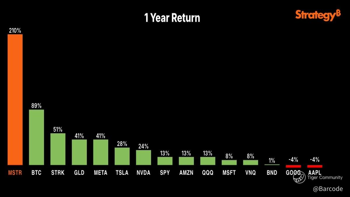 All three are outperforming in 2025, but $MSTR is up 210 % over the past year, dwarfing Bitcoin’s 89 % gain and $STRK’s 51 %. That’s not just leverage, it’s operational execution plus narrative momentum.