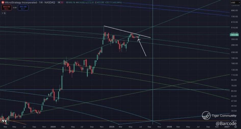 On the weekly Gann square chart, $MSTR has consolidated above the Gann arc for over 2 months, and it’s now pushing toward a diagonal breakout angle near $450. Volume profile shows twin shelves: first support near $346, then $300. I’d treat either of those as retracement entries in a bullish continuation play. Daily MACD is crossing up with a clean histogram flip, RSI(6) prints 68.6, and the 10- and 20-day moving averages have curled upward in tandem. All three key short-term signals flash green.