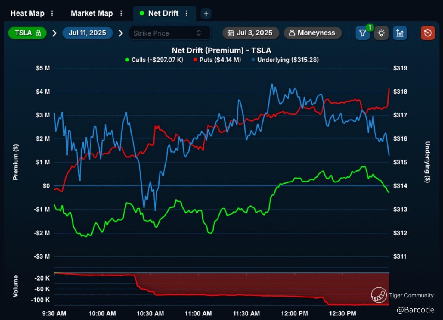 Tesla stock is down 7.14% pre-market to $292.83 on 07Jul25, 🇳🇿NZ Time, wiping out over $22 billion in market cap. The drop isn’t just sentiment-driven, it’s the result of calculated institutional positioning. Just two minutes before the 03Jul25 US close, more than $1 million in premium flooded into 7/11 expiry $TSLA puts at the $300 and $327.50 strikes.