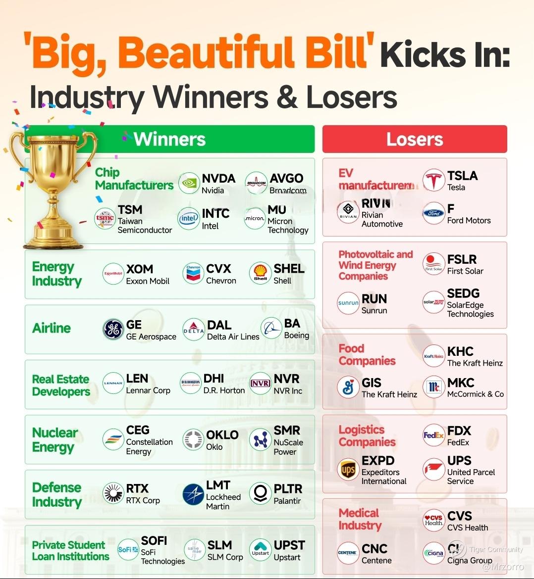– Energy Companies: Fossil fuel industries are big winners. The bill restarts oil and gas lease auctions in Alaska, the Gulf of Mexico’s public lands/waters, and western states; restores lower royalty rates; and increases subsidies for carbon capture used in enhanced oil recovery. It scraps Biden - era green energy subsidies, deregulating oil/gas extraction and pipeline infrastructure. $Exxon Mobil (XOM.US)$ , $Chevron (CVX.US)$ and other upstream firms stand to gain directly.