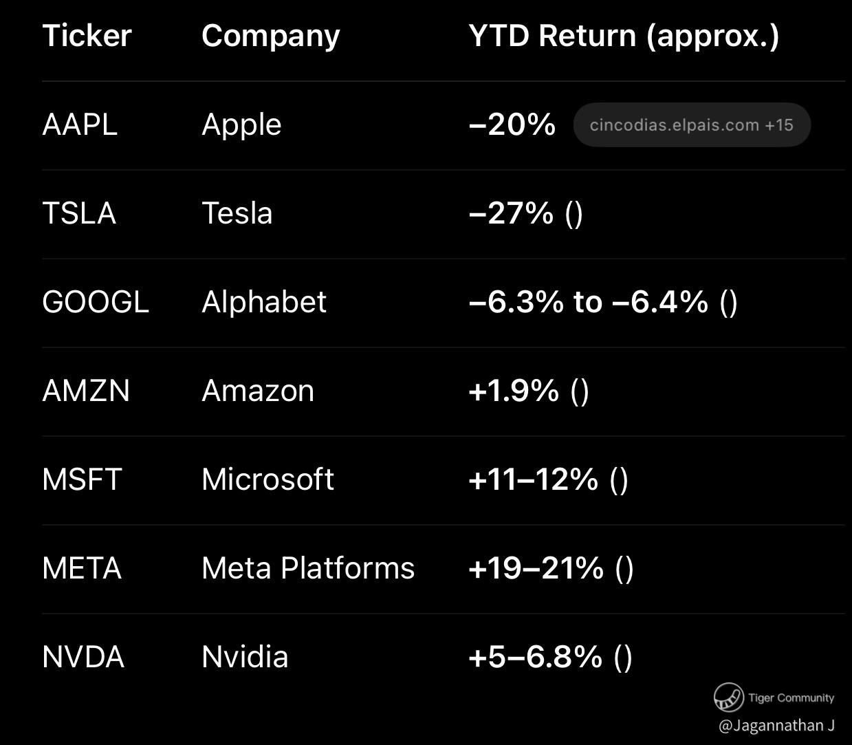 • Lagging/Decliners: Apple and Tesla are at the bottom, down ~20% and ~27%, respectively—dragging on the collective performance.