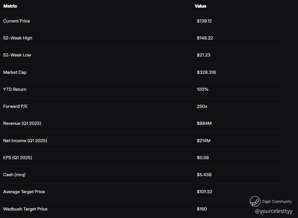 Palantir Technologies ( $Palantir Technologies Inc.(PLTR)$ ) is on a tear, surging nearly 5% to a record high of $139.12 after Wedbush Securities, led by top analyst Dan Ives, raised its price target to a Street-high $160 from $140, dubbing it the “Messi of AI.” With a 100% year-to-date (YTD) gain and a $328 billion market cap, Palantir’s AI-driven platforms are dominating, boasting 36% Q1 2025 revenue growth to $884 million and a $400.7 million U.S. Army contract. But with a 250x forward P/E and tariff risks looming, can PLTR sustain its rally and hit $200 this year? This report dives into Wedbush’s bullish call, Palantir’s growth catalysts, and strategic investment approaches to capitalize on this AI juggernaut while managing risks.
