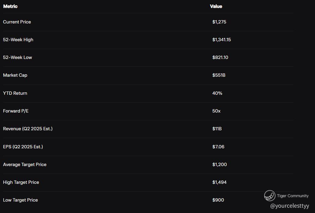 Current Sentiment: With shares at $1,275, analysts and X users speculate a 5-for-1 or 10-for-1 split could be announced, especially if Q2 earnings are strong. A split would lower the price to $255-$127.50, boosting retail interest.