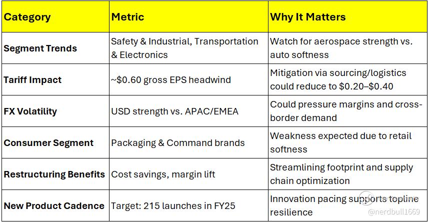 Consumer: (around 20% of revenue). While Q1 saw modest organic growth, consumer spending sentiment remains cautious. Pay attention to performance in filters, respiratory products, and auto care.