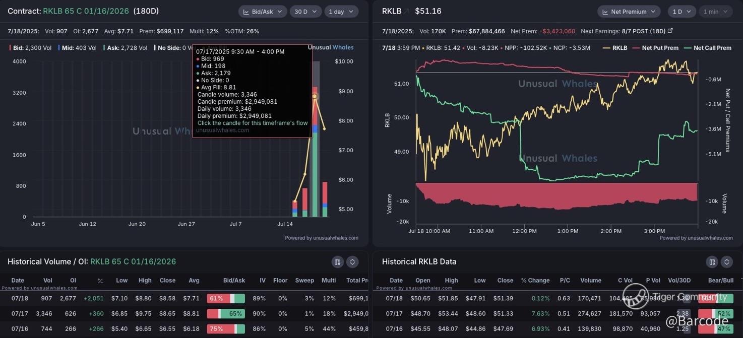20Jul25 NZST 🇳🇿: 🐋 This week, Rocket Lab ($RKLB) just clocked in one of the most aggressive, conviction-fueled LEAPS flows I’ve seen in months; nearly $3 million in premium dropped on the $65 16Jan26 calls. That’s not speculation; that’s positioning.