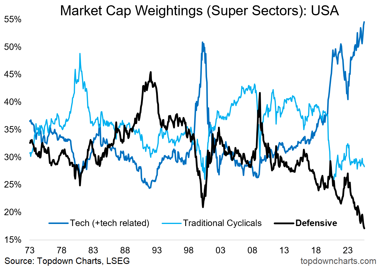 Which brings us to today’s market… While the rise of semis is certainly stark, it’s not the only thing going on in market cap weightings. The Tech “Super Sector” (which corrects for the GICS reclassification that removed a bunch of tech stocks from the tech sector and put them in things like communication services and consumer discretionary) has surpassed the dot-com bubble heights, and at the other end of the spectrum, the defensive sectors (consumer staples, utilities, healthcare) have reached a record low weighting —and even traditional cyclicals (financials, industrials, energy, materials) have been crowded out.