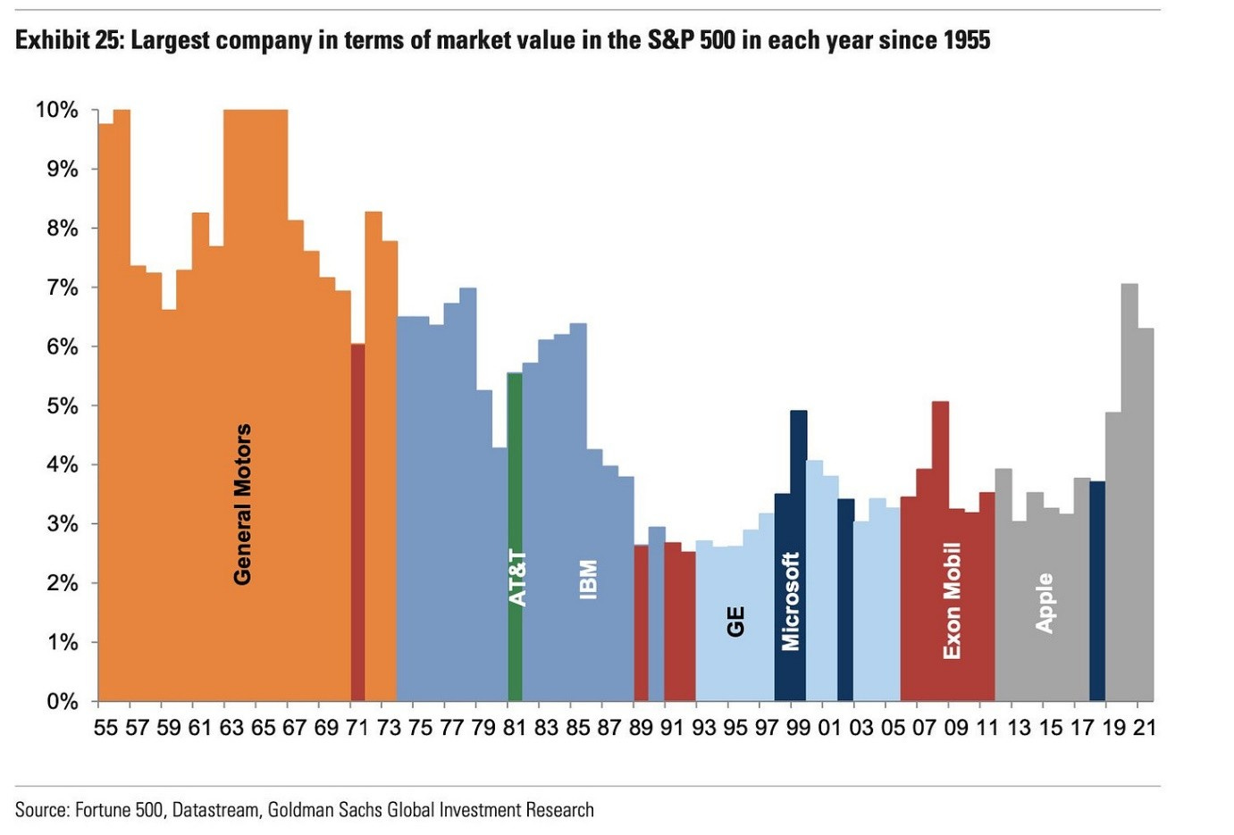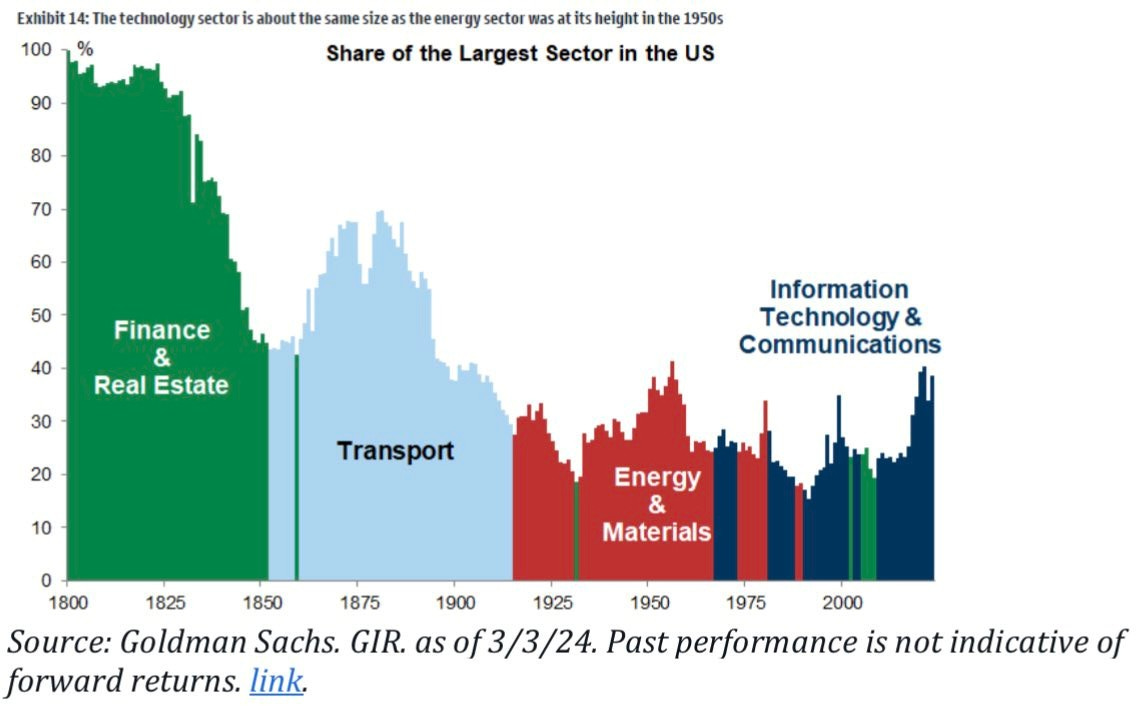 We see the same dynamic illustrated slightly differently with the largest stock — a good example is General Motors being the largest stock for decades during the rise of autos, with IBM, GE, Exon Mobil, and Apple also serving their times. The key point is when you get revolutionary and even just cyclical (e.g. commodity supercycle) changes happening in the economy, business, and markets, it’s only natural to see the leader or posterchild of that theme rise to the top (e.g. as now with NVDA and the AI revolution).
