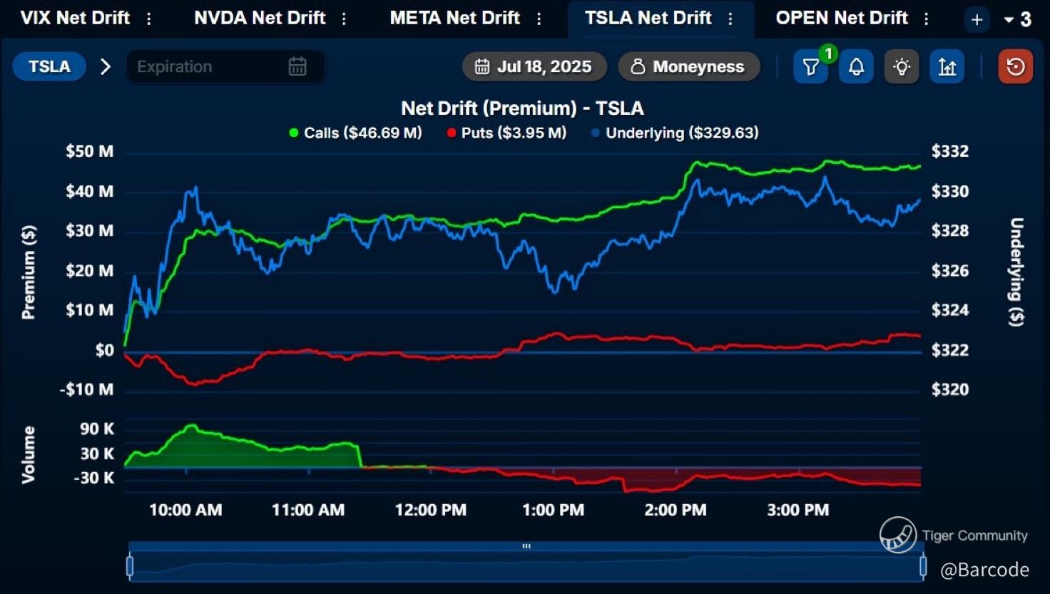 The numbers don’t whisper; they shout. On 19Jul25, Tesla saw a tidal wave of call buying: $46.69M in net premium flowed into the bull side, while put flow was almost nonexistent at just $3.95M. That’s a $TSLA options market telling us something loud and clear: institutions are leaning in ahead of earnings with conviction, not curiosity.