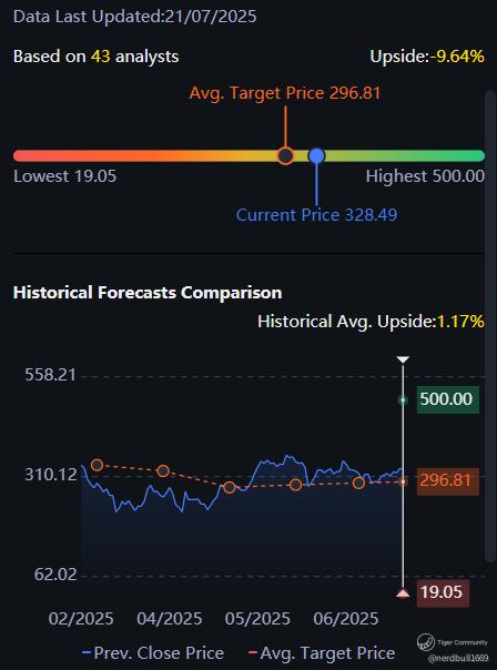 Based on 43 analysts from Tiger Brokers offering 12 month price targets for Tesla in the last 3 months. The average price target is $296.81 with a high forecast of $500.00 and a low forecast of $19.05. The average price target represents a -9.64% change from the last price of $328.49.
