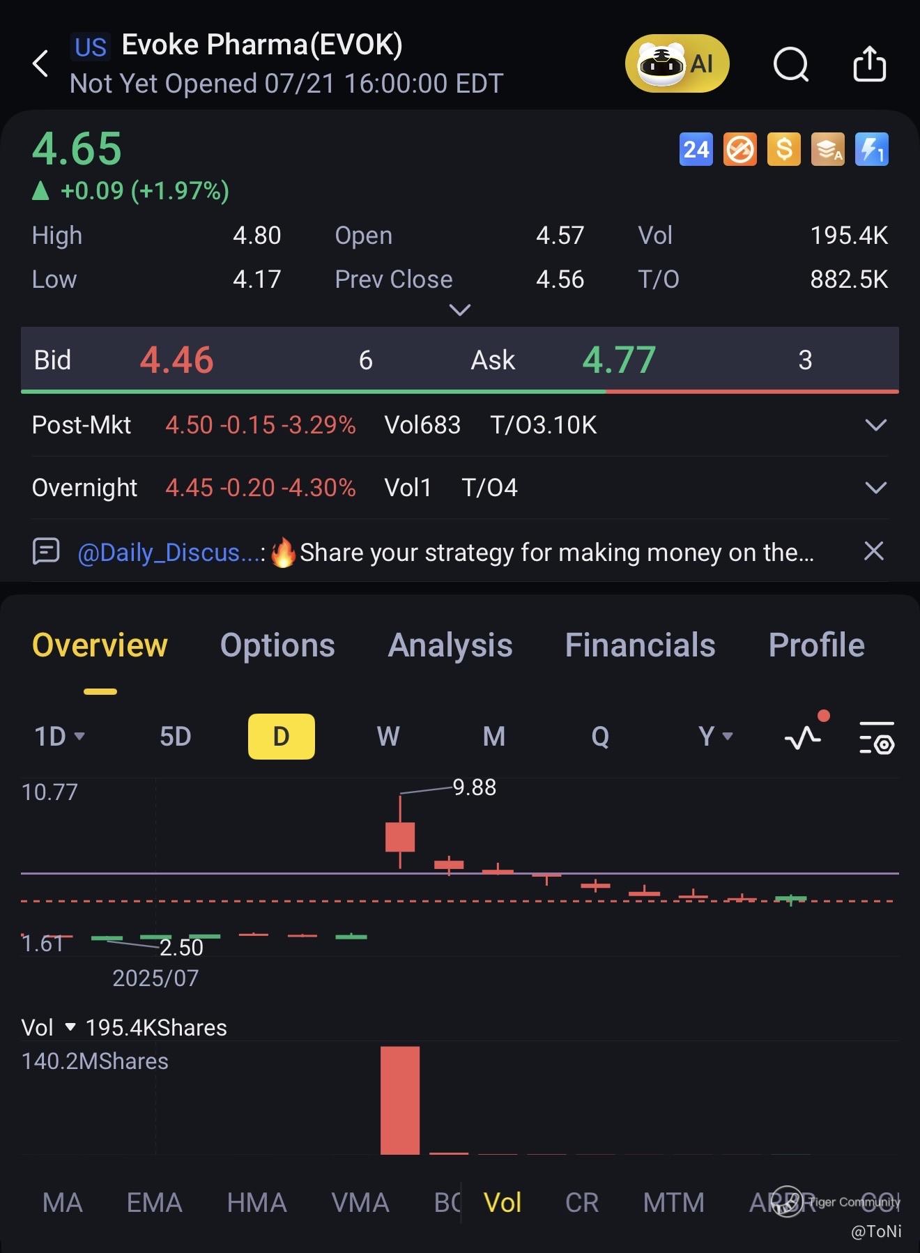 Technically, EVOK is showing signs of a breakout. As of July 21, 2025, the stock closed at $4.65, up 1.97% from $4.56, with a daily high of $4.80 and a low of $4.17. It trades well above its 50-day moving average of $3.47 and 200-day moving average of $1.67, a bullish signal for short-term traders. The recent spike to $9.88 suggests strong buying interest, though the pullback to $4.65 indicates a consolidation phase.