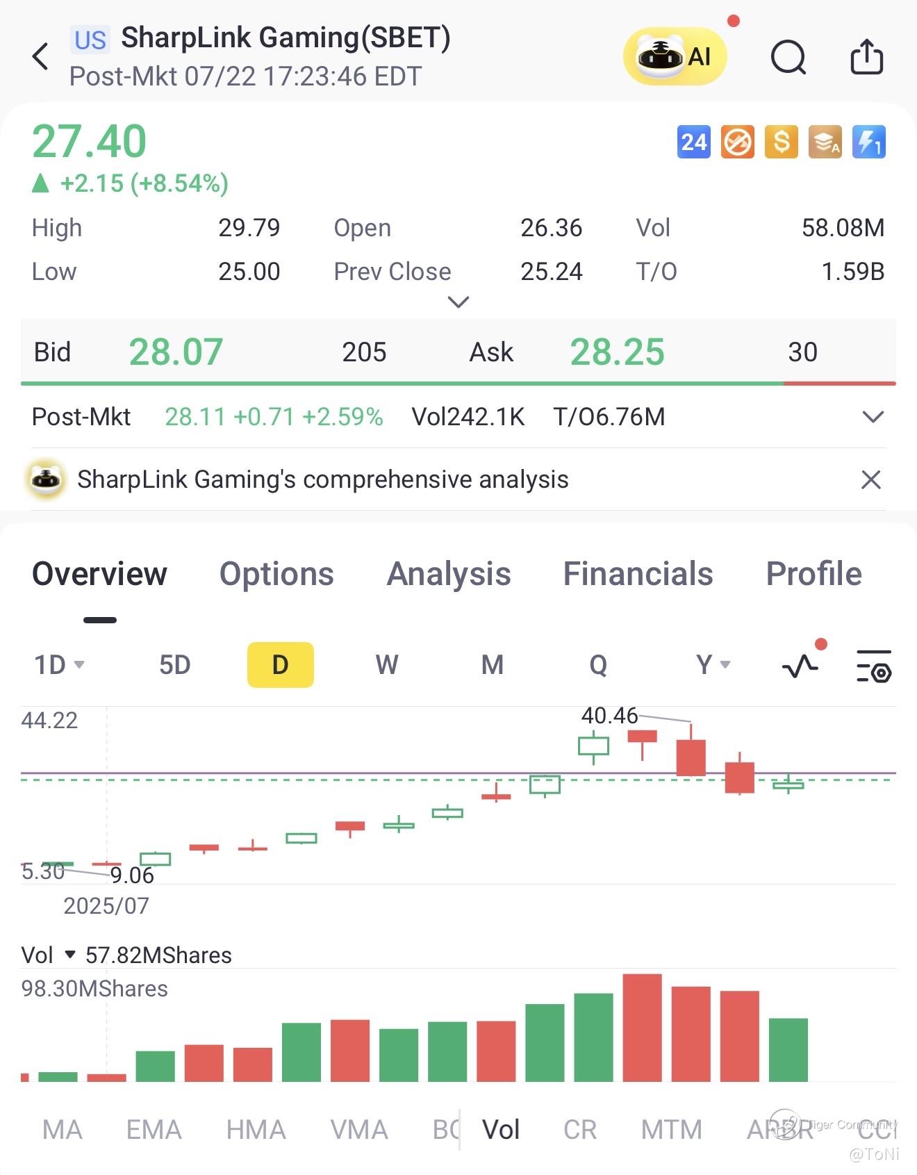 Technically, SBET’s chart signals a bullish trend. After rebounding from a $9 low, the stock closed at $28.11 in after-hours trading on July 22, up 2.59% with an intraday gain of 8.54% to $27.40. Trading volume spiked to 58.08 million shares, well above the 98.30 million average, reflecting strong buying interest. The daily chart shows a decisive break above the $40.46 resistance, hitting a high of $44.22, with short-term moving averages (5-day, 10-day) trending upward. Though the MACD hints at a sell signal, the broader momentum remains positive. Analysts project a next target of $80, based on the 61.8% Fibonacci extension, especially if Ethereum’s rally persists. A minor pullback to $26-$27 could offer a strategic entry, given the 14-day RSI of 24.632 indicates oversold conditions.