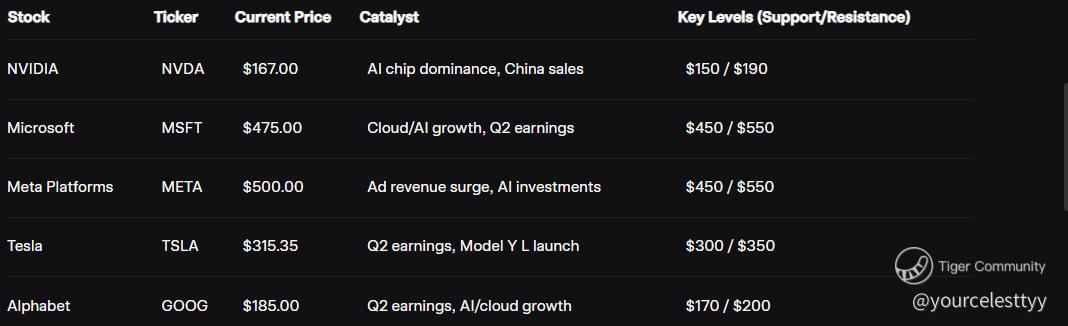 • NVIDIA ( $NVIDIA(NVDA)$ ): Up 171% YTD, with Q2 earnings (August 27) expected at $47B. Targets $190-$220, with support at $150.