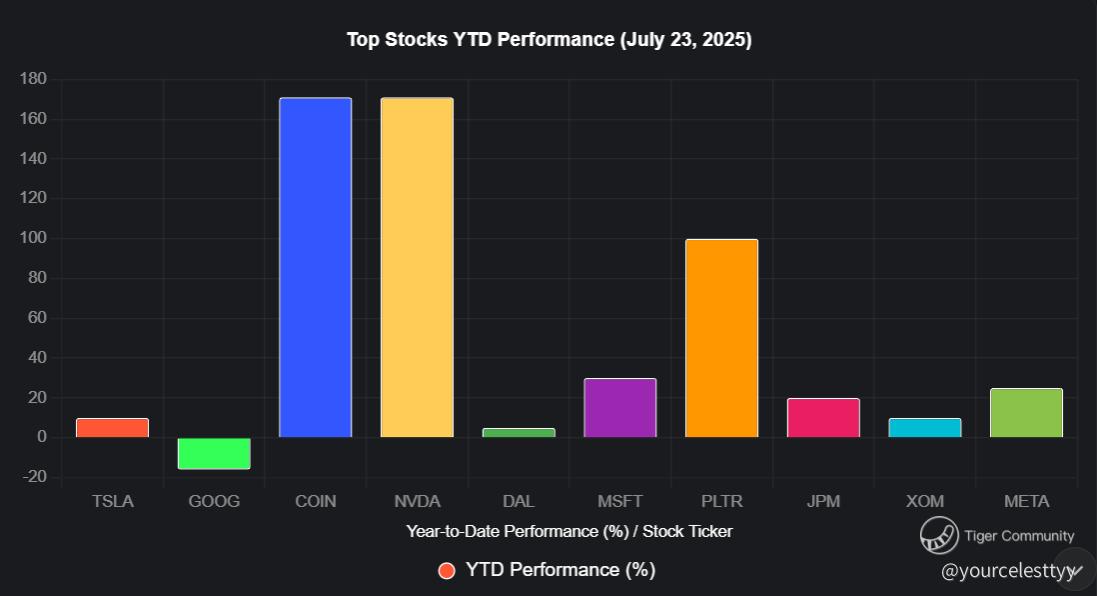 • Coinbase ( $Coinbase Global, Inc.(COIN)$ ): Up 171% YTD to $398.20, driven by Bitcoin’s $119K surge and Crypto Week. Targets $420, with support at $350.
