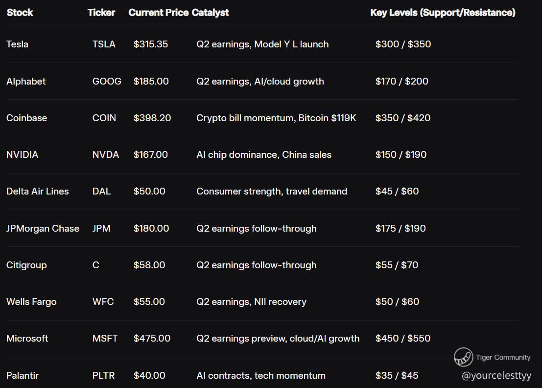 • Tesla ( $Tesla Motors(TSLA)$ ): Up 10% YTD to $315.35, Q2 earnings expect $0.28 EPS and $22.72 billion revenue. Musk’s commentary could drive a breakout to $350-$400 or a dip to $300 if guidance disappoints.
