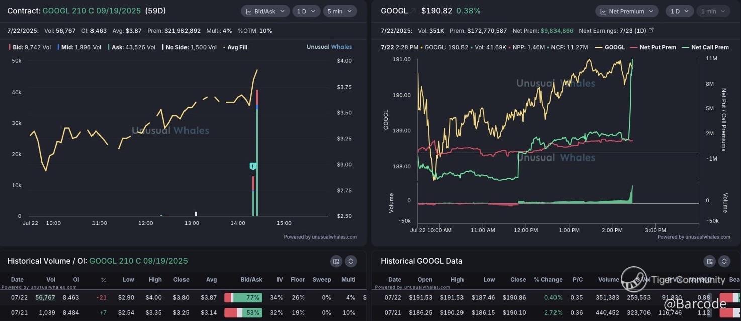 I’m extremely optimistic about Google’s earnings. Not just because of the trend, but because of what’s happening beneath the surface. Over $22M in call premium just surged into the 210C Sep19 contracts; volume was 56,767, or 77% of total open interest. That’s institutional-sized positioning ahead of a catalyst.