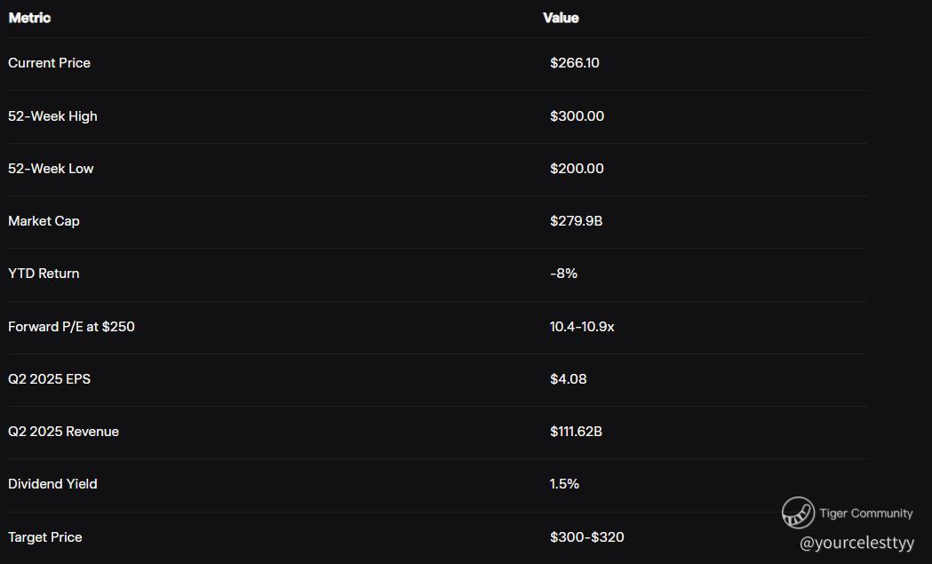 Consensus: The median price target is $300, suggesting 13% upside from $266.10, per TipRanks, though some analysts see downside to $250 if challenges persist.