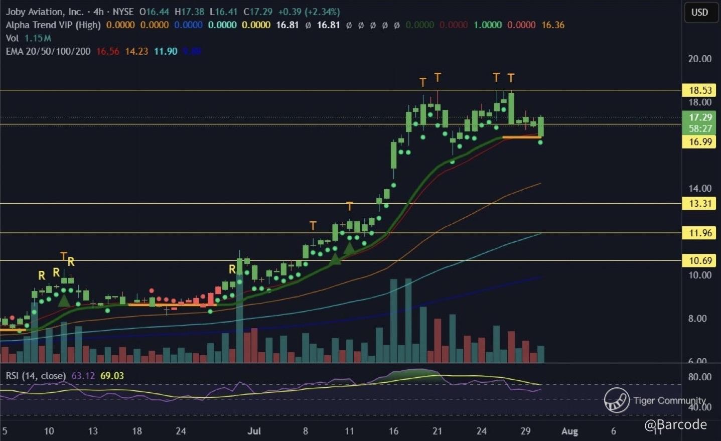 Technically, JOBY’s 4H RSI sits at 63.12 and MACD remains flat, suggesting a coiled spring beneath the surface. The 20/50 EMA cluster at $16.56/$14.23 is providing dynamic trend support. ETF flows reflect tension too: ARKQ and ARKX trimmed a combined 57,739 shares this month, possibly locking in gains on the +82% YTD run (+783% YoY), not reversing thesis conviction. A reversal here could attract reaccumulation from thematic players.