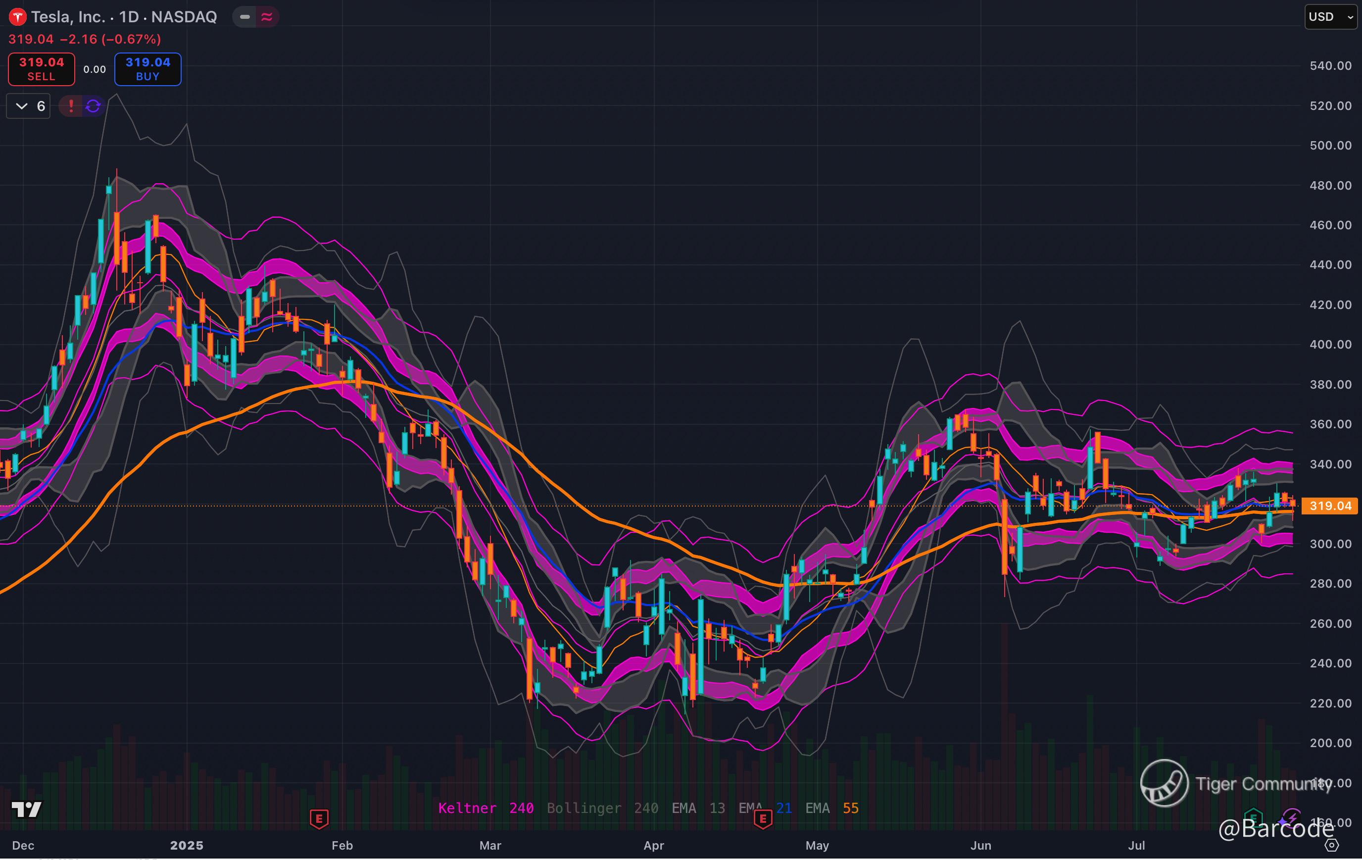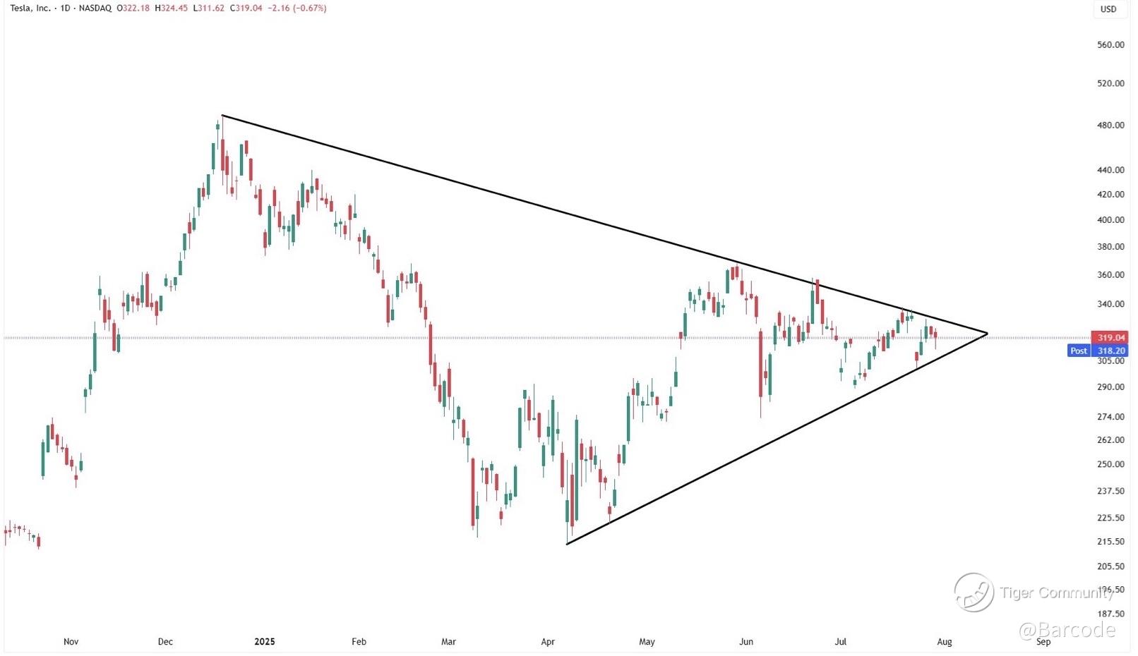 I’m convinced $TSLA is on the brink of an inflection that could redraw 2025’s EV and autonomy landscape. The daily symmetrical triangle is nearing its apex, with price compressing under multi-month resistance and perched just above rising support, currently trading at $319.04.