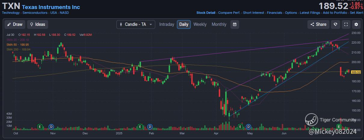 Texas Instruments Inc. (TI) experienced an 11 percent drop in its stock price following its Q2 2025 earnings release, as executives delivered a cautious outlook amid rising tariff uncertainty and weakening analog chip demand. While Q2 revenue of $4.45 billion and EPS of $1.41 exceeded estimates, management warned that the strength may have been driven by customers pulling forward orders ahead of looming tariffs. The subdued Q3 profit guidance and geopolitical headwinds have reignited investor concerns: is TI merely digging in for cyclical softness, or is this a strategic inflection point in a broader semiconductor slowdown?