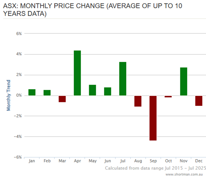 Over the past 10 years seasonality in Australia is very similar to the US. $S&P/ASX ALL ORDINARIES(XAO.AU)$