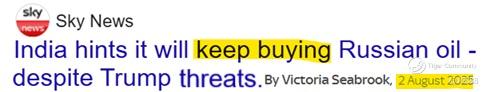 On the other hand, 2 Indian government sources told Reuters on Saturday, India will continue to purchase oil from Russia despite Trump's threats and much to his irks. (see above)