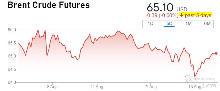 Brent crude futures has been falling since Mon, 11 Aug 2025 to $65.10 a barrel. (see above)