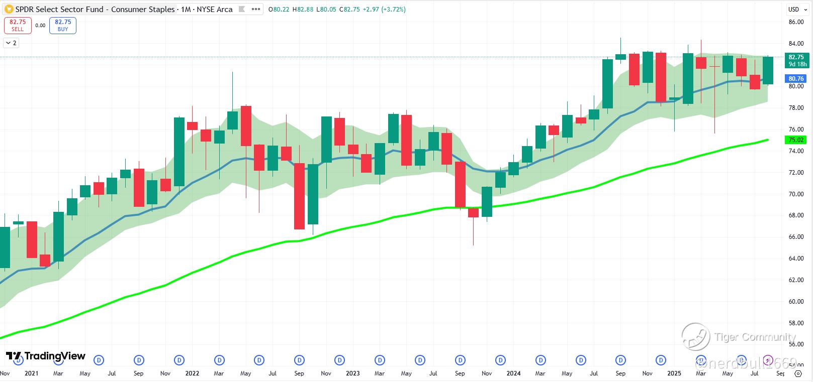 Whereas we looked at $Consumer Staples Select Sector SPDR Fund(XLP)$ , where we can see the consumer defensive stocks are having a good green day, looking at the monthly EMAs, you would noticed that it is trading near or below the 12-EMA, so this is the same reason why there is no pull back seen from this sector.