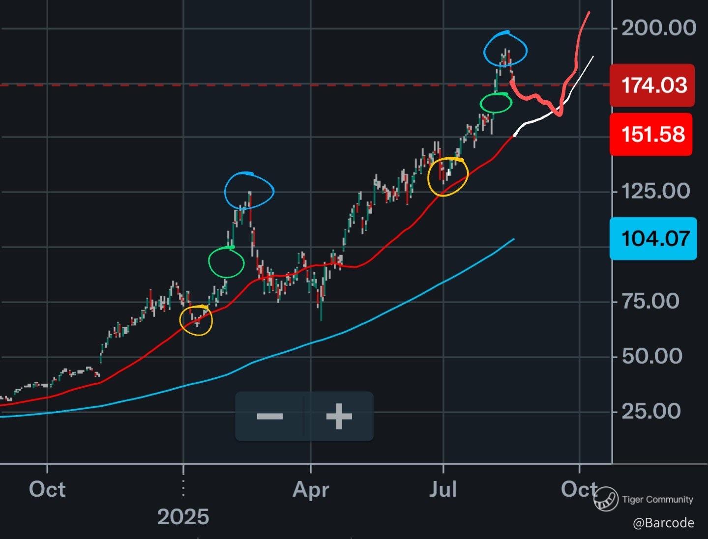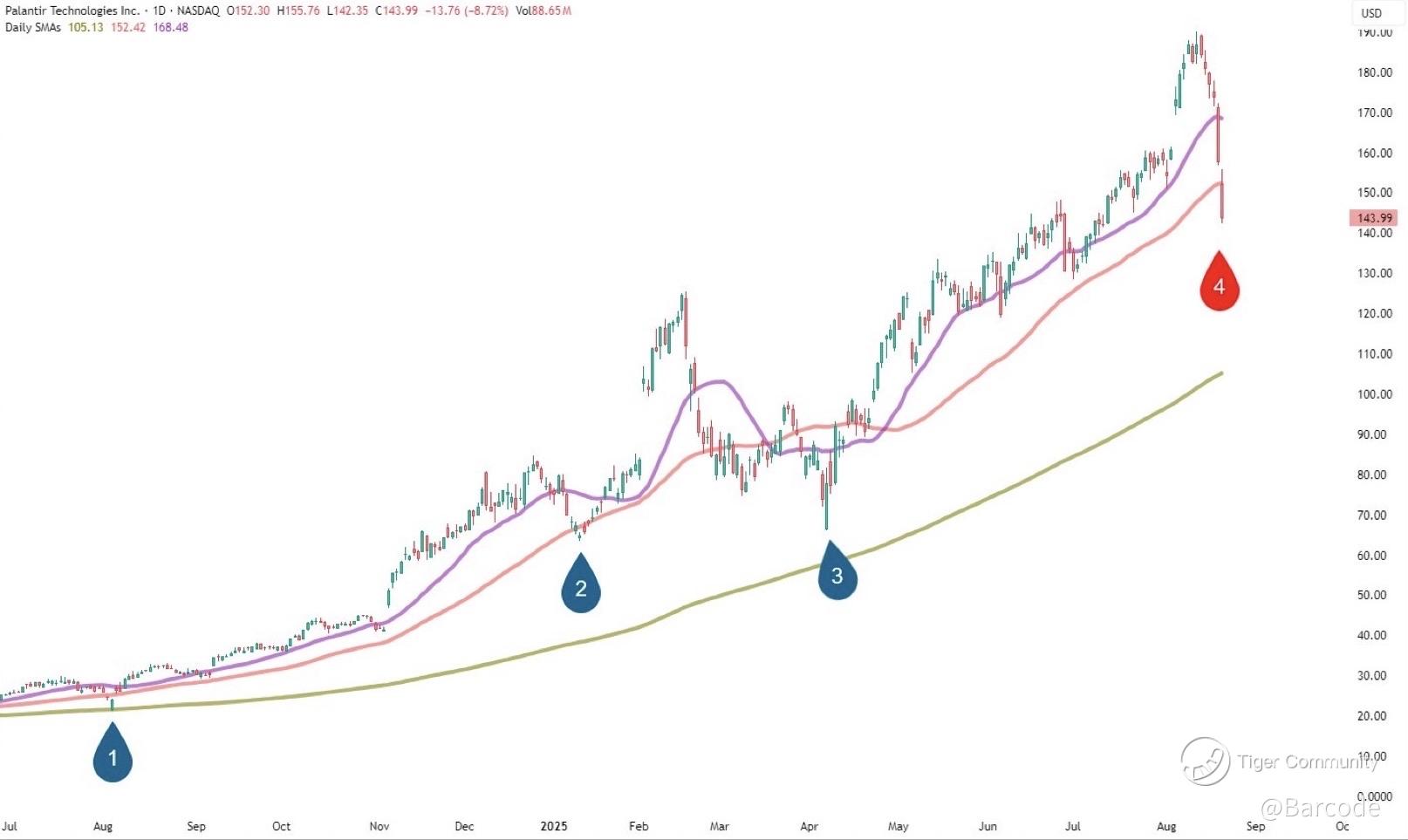 • Over the past year, Palantir has recovered the 50-day moving average three separate times, each serving as a springboard for fresh rallies. Today marks the fourth test, but unlike before, price sliced decisively lower, down another 10%. The chart highlights this sequence with three successful defenses and a current breakdown that aligns ominously with the Citron short thesis. Whether “the fourth time is a charm” will depend on whether bulls can quickly reclaim the 50DMA or whether bears press momentum toward $135–140.