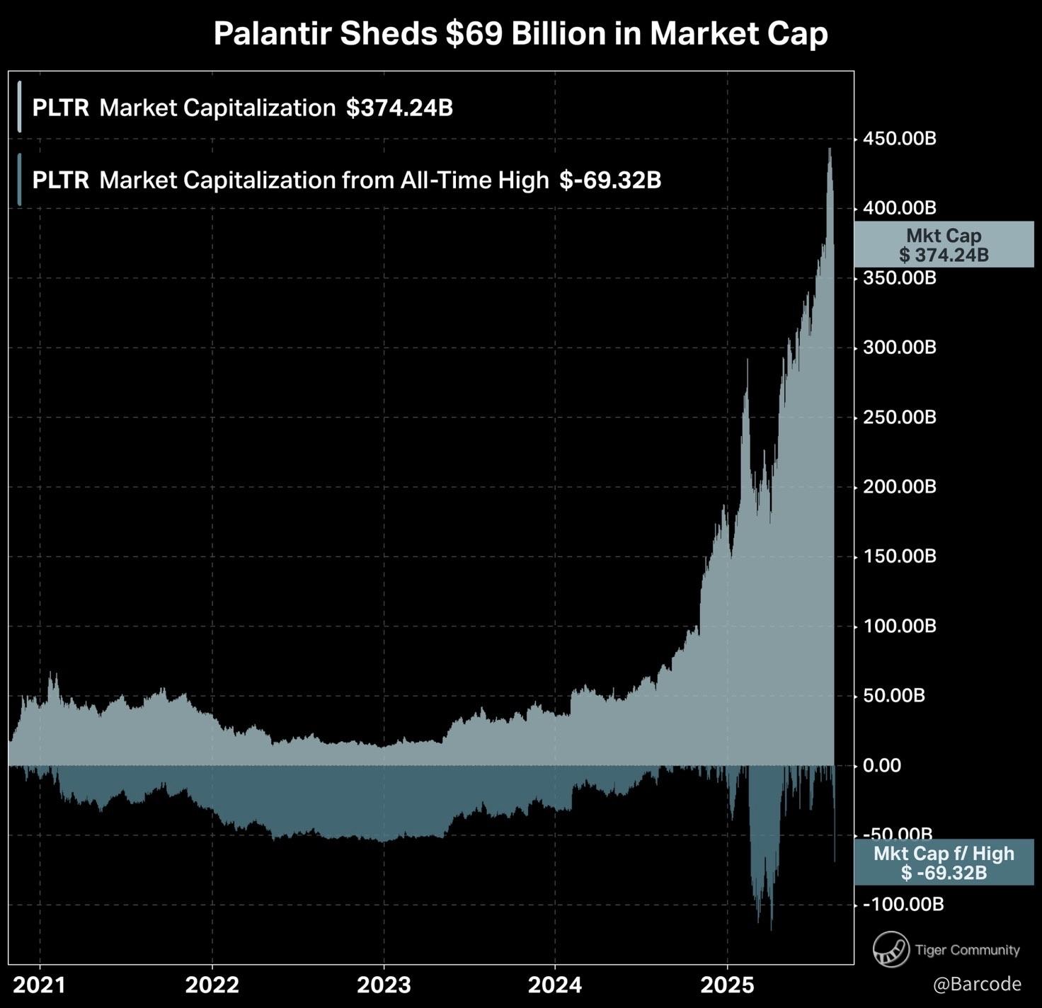 Palantir’s market capitalisation currently sits at $374.24B, after shedding $69.32B in a single week. While dramatic, the company has seen worse periods in the past and rebounded. What’s different this time is the scale: this wipeout came immediately after the stock peaked at nearly half a trillion dollars in value.