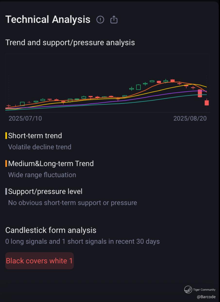 • Candlestick system flagged “Black covers white 1,” aligning with a volatile decline trend and “no obvious short-term support.”