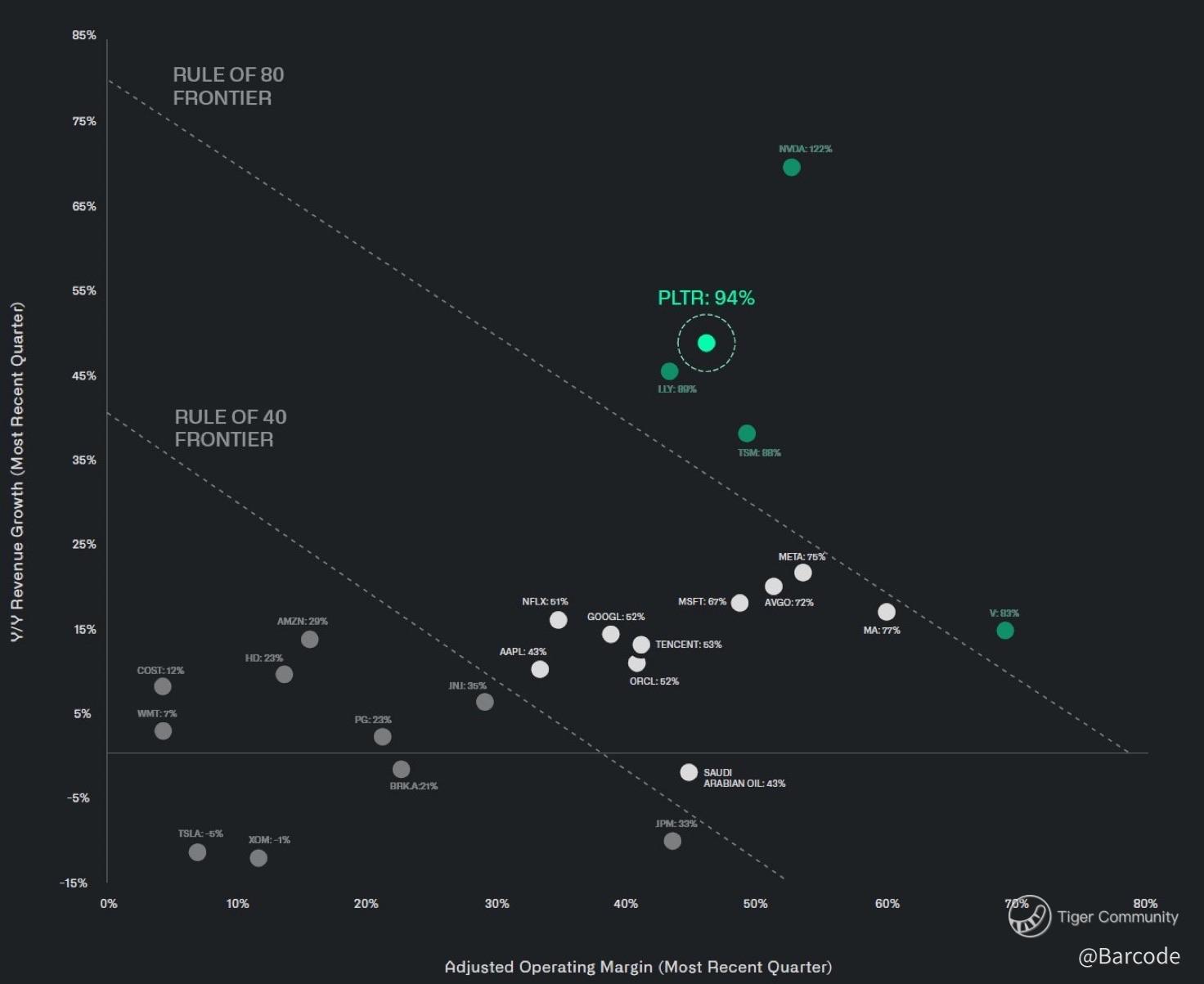 Palantir delivered record Q2 revenue of $1.0B, +48% YoY, with adjusted EPS of $0.16 (+77% YoY). Net income surged to $326.7M, and adjusted op. margin exceeded 40%. U.S. Commercial revenue rocketed +93% YoY while Government revenue added +53%. TCV booked $843M in U.S. Commercial (+222% YoY) and $2.8B overall RDV (+145%). Net dollar retention hit 128%, cementing the “Rule of 94.” Despite this, valuation is stretched absurdly: 214x forward earnings vs S&P 500 at 22x, and 588x trailing P/E vs Nvidia’s 58x.