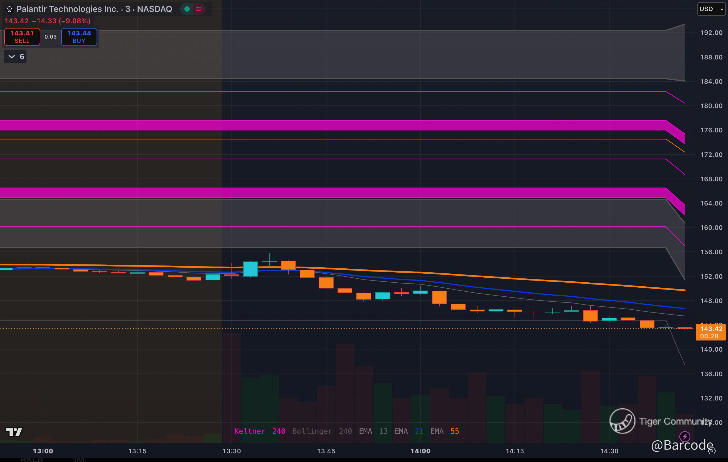 • 2-minute chart: EMA 13 < EMA 21 < EMA 55, price hugging the lower Keltner and Bollinger, capped at ~147–148. Overhead supply bands stacked 160–164, 168, 172–176. Intraday tape signals relentless sell pressure until EMA 55 is reclaimed on volume.