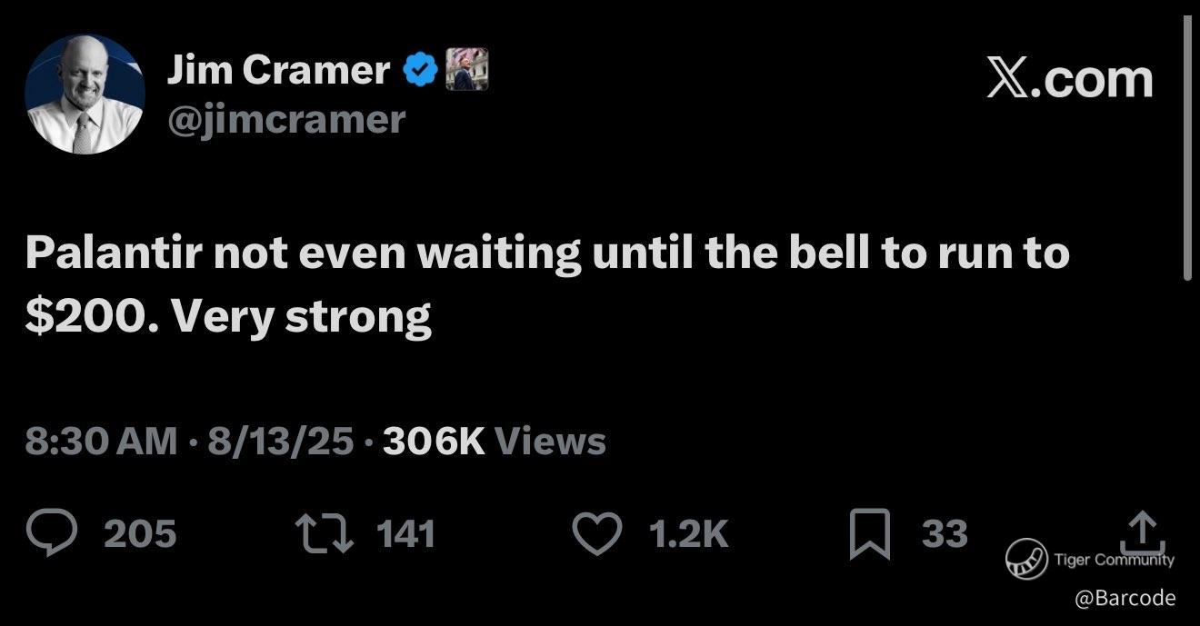• Cramer 13Aug: “Palantir … run to $200. Very strong.” Price now $143