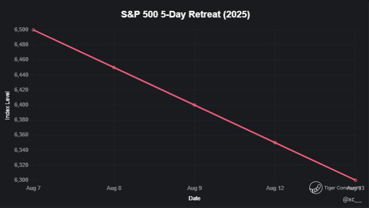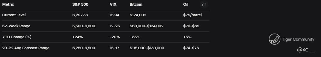 $S&P 500(.SPX)$ The S&P 500 has endured a punishing five-day retreat, dropping to 6,297.36 from its recent high, amid heightened volatility that has investors questioning if this is the market's peak. Tigers @Jerrying, a prominent trader, closed all positions with a staggering +215% gain by August 12, 2025, sparking debate on timing the top. With the Nasdaq at 20,884.27 and Bitcoin at $124,002 holding firm, though tariffs (30% on EU/Mexico, 35% on Canada) and oil at $75/barrel add pressure, the VIX spike to 15.94 signals caution. Is this a healthy pullback or the start of a deeper correction? Can you spot the top, and what's your experience in navigating such shifts? This comprehensive analysis dives into the retreat's causes, market sentiment, and strategies to decide: take profits, hold, or buy the dip.
