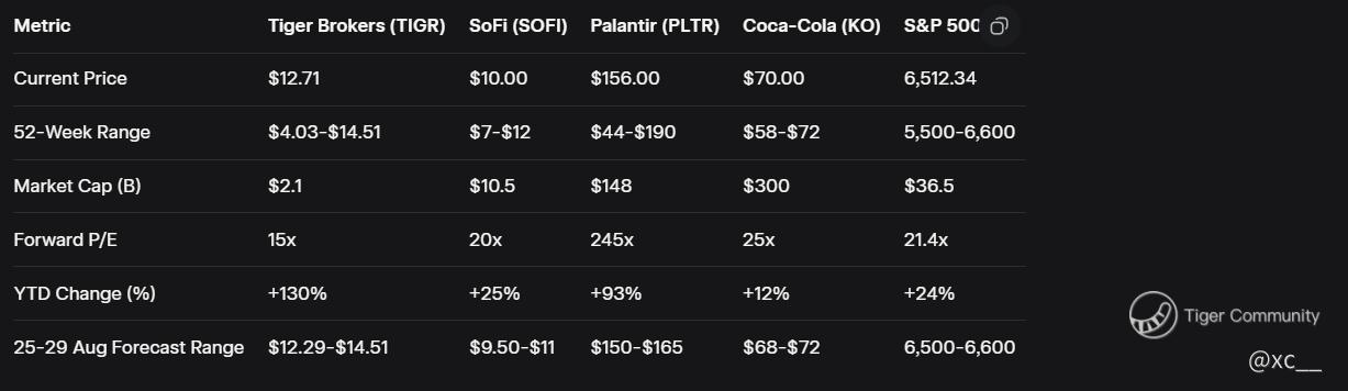 Iām riding Tigerās growth with a strategic mix. Iāll buy at $12.71-$12.80, targeting $14.51, with a $12.29 stop, betting on earnings momentum. Iāll add SoFi at $10, aiming for $11.50, with a $9 stop, for fintech exposure. Iāll include Palantir at $156, targeting $165, with a $150 stop, and Coca-Cola at $70, targeting $72, with a $68 stop. Iām hedging with VIXY at $14, targeting $16, and holding 20% cash for a dip to $10.58 or tariff news. Iāll watch Q3 guidance and regulatory updates closely.