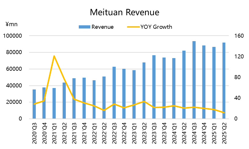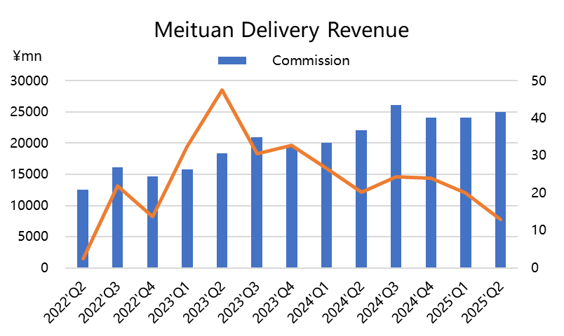 Revenue reached 91.84 billion yuan, up 11.7% year-on-year, falling short of market expectations of 93.69 billion yuan. While overall domestic food delivery order volume continued to grow, average order revenue and commission rates faced pressure due to subsidy-driven competition. The "volume up, prices down" trend accurately characterized Q2 performance. Amidst intense competitive pressures, revenue growth momentum remained challenging to boost.
