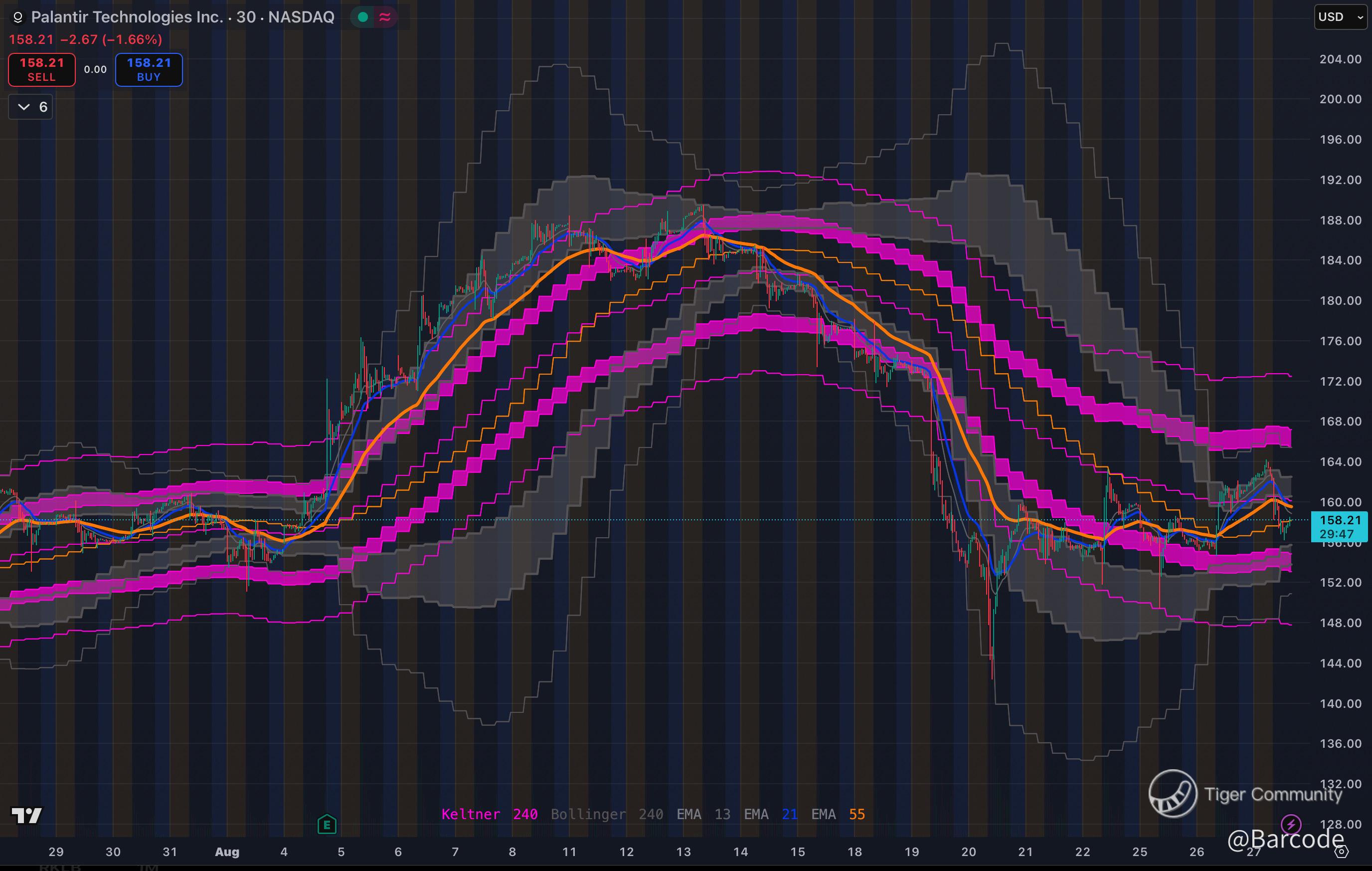 I’m seeing Keltner and Bollinger bands tightening after the August expansion. This tells me a new move is brewing. Options flow shows heavy call positioning into $165 but the flush brought in hedging pressure. Dealer gamma likely flips around $155–$157, meaning this area isn’t just technical, it’s flow driven.