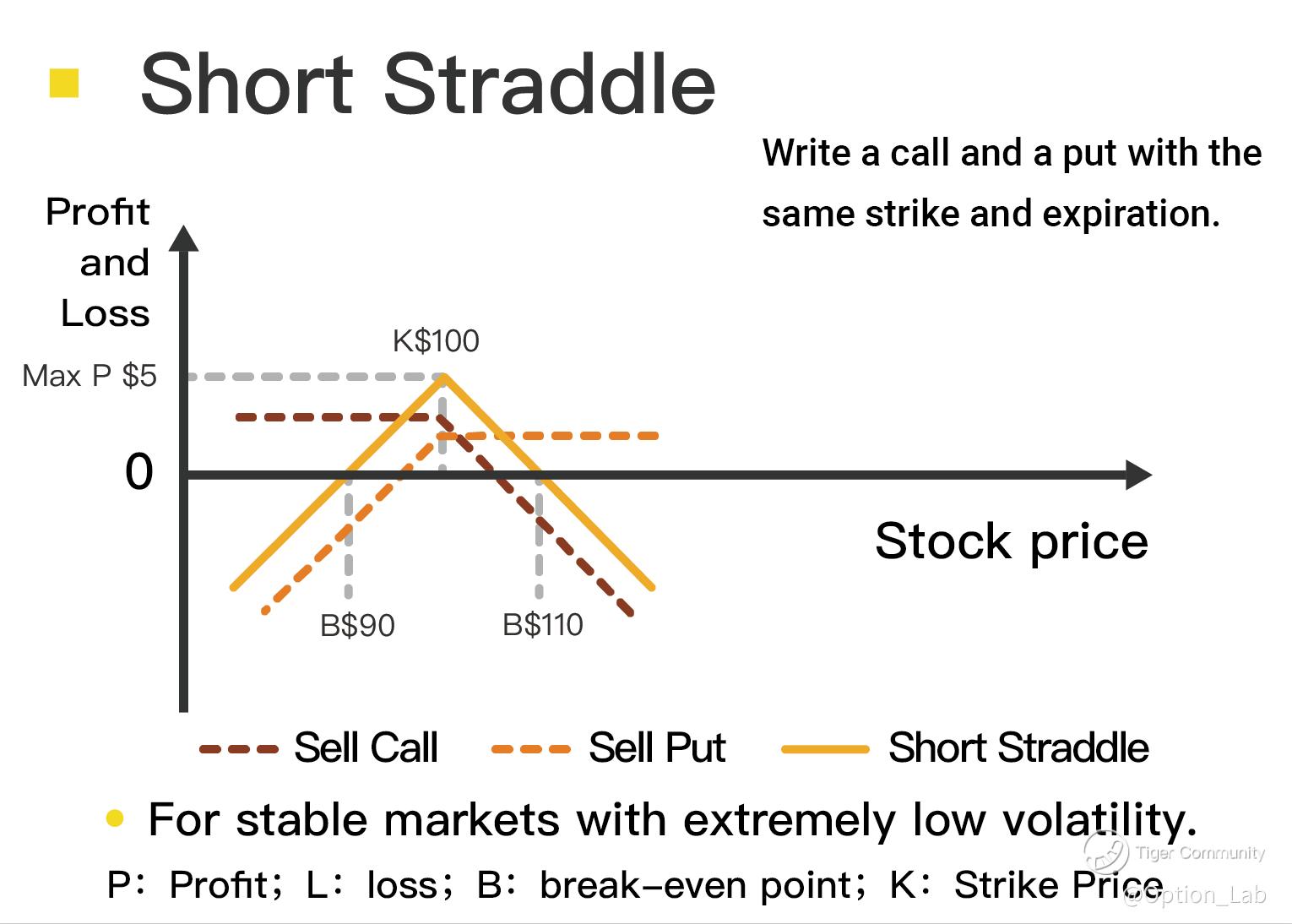 Short Straddle: Sell a call and a put at the same strike price on the same expiration date.