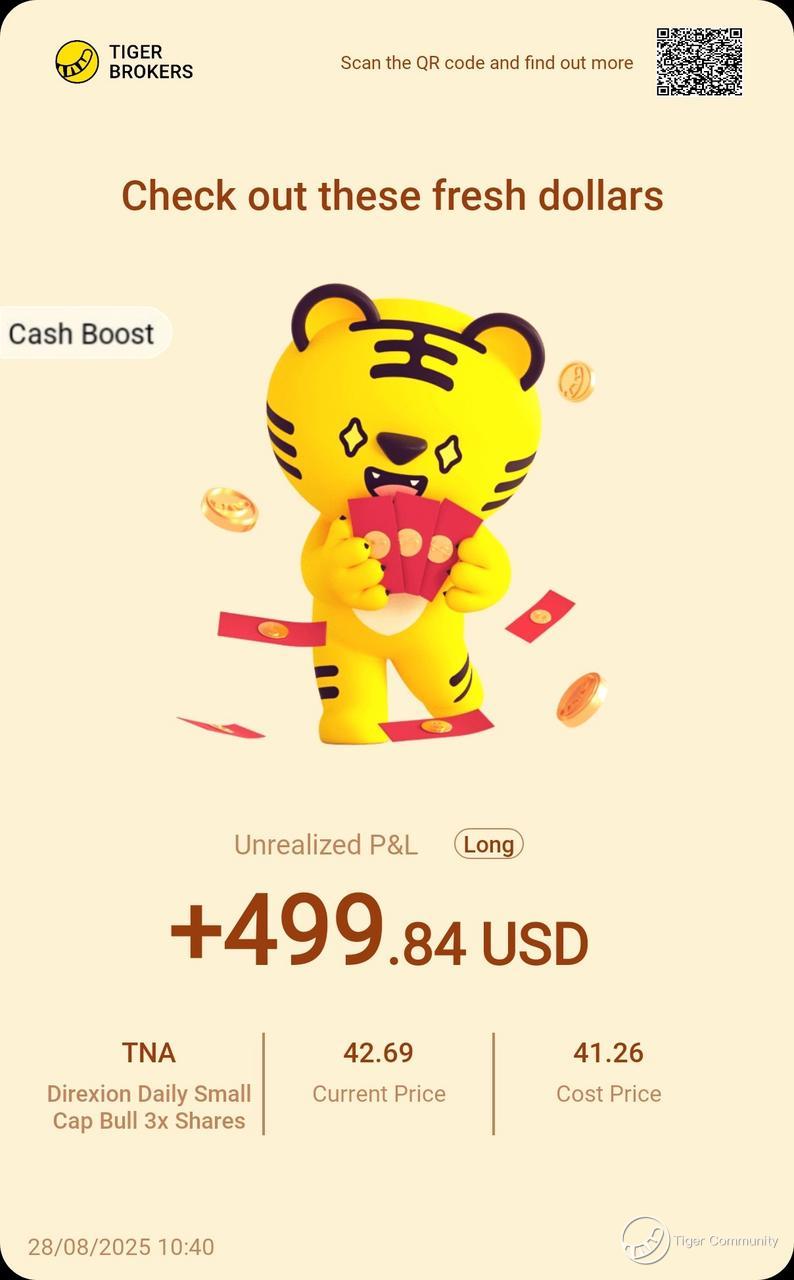 $Direxion Daily Small Cap Bull 3x Shares(TNA)$ 's 3x small-cap ride was wild! Russell 2000 popping on strong data, caught the perfect wave. But leveraged ETFs are rollercoasters - cashing out gains and waiting for the next dip!