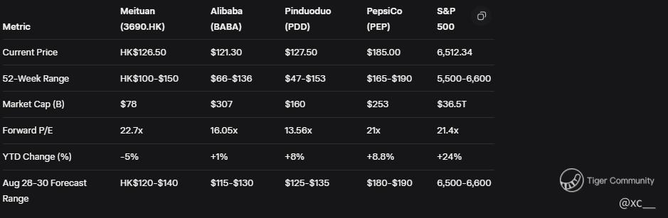 Meituan’s 90% profit drop to RMB 1.49 billion and Alibaba’s 12% surge to $121.30 on August 28, 2025, reflect the delivery war’s intensity amid a 6,512.34 S&P 500 and $123,456 Bitcoin rally. A 5-10% Meituan rise to HK$132.50-$139 or Alibaba to $127-$133 is possible this week if $120-$115 supports hold, with year-end targets of HK$180 (42% upside) and $150 (24% upside) if growth holds. A 10-15% dip to HK$107-$113 (Meituan) or $109-$115 (Alibaba) threatens if subsidies persist, with PDD’s $120 support key. The war’s end could stabilize profits—play smart with X VIXY or GLD hedges, or wait. The underdog's thrill is on—your bet?